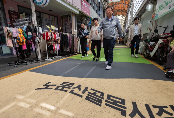 ▲ "산뜻하고 안전한 전통시장으로 재탄생!" 광진구, 노룬산·영동교골목시장 디자인 바닥 포장 완료 |