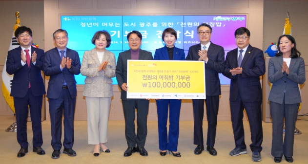 광주광역시는 18일 시청 비즈니스룸에서 강기정 시장, 노현주 KB국민은행 호남지역그룹대표, 김병인 전남대 부총장, 전제열 조선대 부총장, 박상철 호남대 총장, 이선재 광주여대 총장, 송미령 광주과학기술원 학생처장 등이 참석한 가운데 ‘천원의 아침밥 기부금 전달식’을 가졌다.