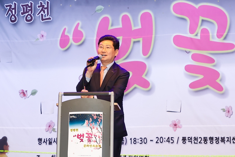 ▲ 이상일 용인특례시장이 지난 12일 풍덕천2동 행정복지센터 주차장과 정평천 일원에서 열린 정평천 벚꽃 문화민속축제에서 인사말을 하고 있다. |