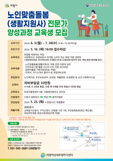 ▲ 의왕시 여성새로일하기센터, ‘노인맞춤돌봄(생활지원사) 전문가 양성과정’교육생 모집 |