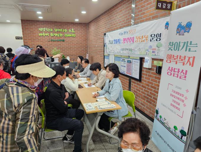 주민밀착형 복지행정을 적극적으로 수행하기 위해 복지지원과 통합조사계에서올해 처음 실시하는 ‘찾아가는 행복 복지 상담실’은 정보소외층 밀집지역을 찾아가서 최신 복지서비스 정보를 제공한다.