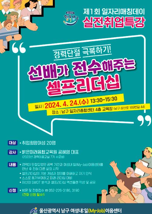 [뉴스서치] 울산 남구 여성내:일(My-Job)이음센터는 오는 24일 취업희망여성들을 대상으로 취업노하우와 자신감을 고취시키기 위한 실전취업특강을 운영한다고 밝혔다.