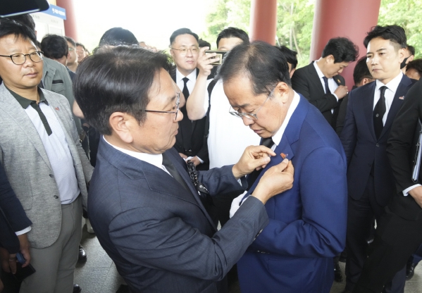 ▲ 강기정 광주광역시장이 제44주년 5·18민주화운동 기념식을 하루 앞둔 17일 오전 북구 운정동 국립5·18민주묘지를 찾은 홍준표 대구광역시장에게 5·18 배지를 달아주고 있다./광주광역시 제공 |