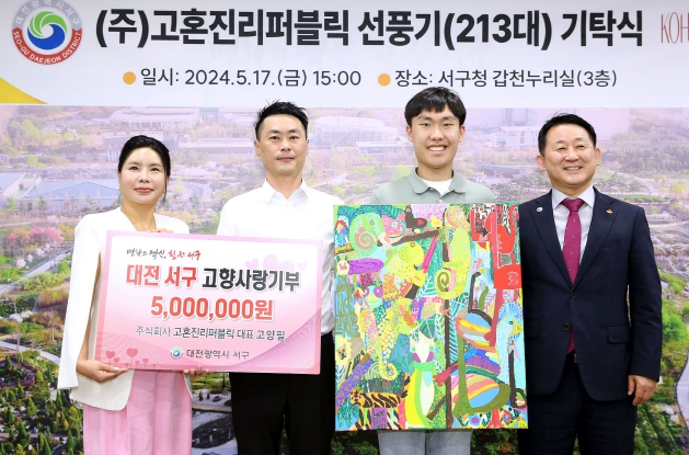 [뉴스서치] 대전 서구가 17일 ㈜고혼진리퍼블릭로부터 고향사랑기부금 최고액인 500만 원과 관내 취약계층을 위한 선풍기 213대(2,300만 원 상당)를 기부받았다.