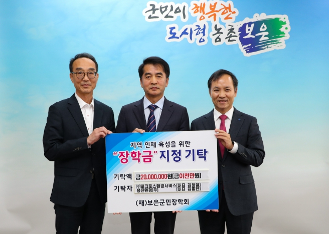 최채형 군수는 “보은군 학생들의 밝은 미래를 위해 어려운 상황에서도 따뜻한 마음으로 장학금을 기탁해 주신 ㈜테크로스환경서비스 김정철 대표님과 용진환경(주) 김홍찬 대표님께 감사하다”며 “기탁받은 장학금은 보은군의 미래를 책임질 인재 양성을 위해 소중하게 사용하겠다”고 말했다.