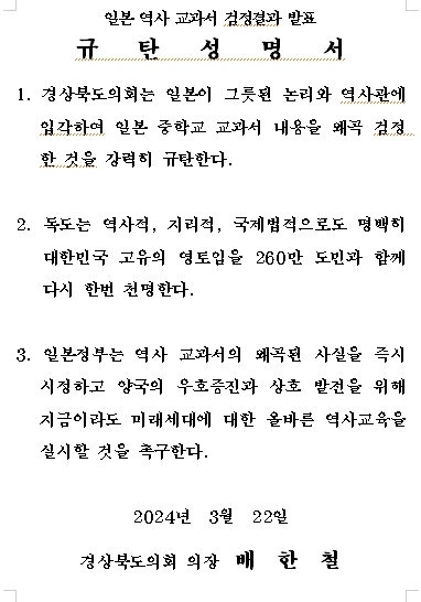 배한철 경북도의회 의장은 “일본정부의 그릇된 논리와 역사관에 입각하여 내년부터 사용될 중학교 교과서에 역사적 사실을 왜곡하여 검정한 것에 대해 강력히 규탄한다.”라고 밝히며, “양국의 올바른 역사인식 하에 비로소 미래세대의 우호증진과 상호발전을 도모할 수 있는 만큼 지금이라도 참된 역사교육을 실시할 것”을 촉구했다.