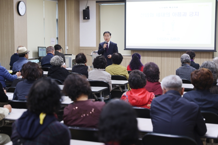 이날 특강은 ‘산업화 세대의 아픔과 긍지’라는 주제로 진행됐으며 노인대학 학생 45명이 참석했다.