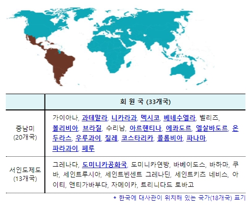 ▲ 중남미 외교단(GRULAC) 33개국 현황 |