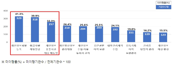 ▲ 법적 의무사항 이행 진단(정량지표) 결과 하위 10개 항목 |