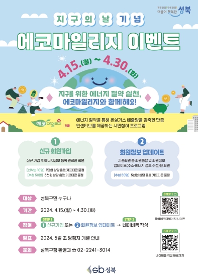 [뉴스서치] 서울 성북구가 오는 4월 15일부터 30일까지 지구의 날을 맞아 기후변화 및 탄소중립에 관한 관심을 높이고 에너지 절약 실천에 동참할 수 있도록 에코마일리지 가입 이벤트를 진행한다.