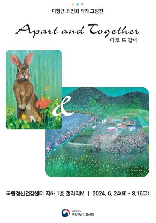 [뉴스서치] 보건복지부 국립정신건강센터(센터장 곽영숙)는 오는 6월 24일 오후 3시 국립정신건강센터 지하 1층 전시관 갤러리 M(서울시 광진구 소재)에서 ‘따로 또 같이(Apart and together)’ 전시 오픈 행사를 개최한다.