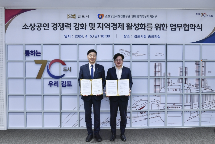 ▲ 김포시가 5일 소상공인시장진흥공단 인천경기북부센터본부와 소상공인 경쟁력 강화 및 지역경제 활성화를 위한 업무협약을 체결했다. |