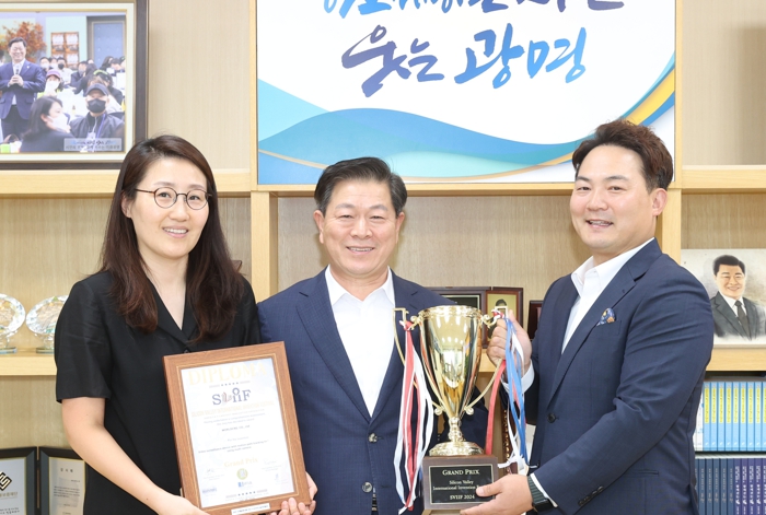 [뉴스서치] 박승원 광명시장은 지난 9일 시장실에서 ‘2024 미국 실리콘밸리 국제발명페스티벌’에서 발명품 대상을 수상한 관내 사회적기업 ㈜월드씨엔에스 조성현 대표, 김혜진 씨와 간담회를 가졌다.