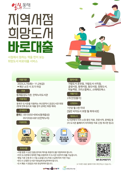 ‘지역서점 희망도서 바로대출’은 도서관과 지역서점이 연계하여 이용자가 신청 도서를 가까운 지역서점에서 빌린 후 도서관에 반납할 수 있는 서비스로 이용자는 각 동래구 도서관 홈페이지 내 지역서점 희망도서 바로대출 신청 페이지를 통하여 상시‘희망도서 바로대출’을 신청할 수 있으며, 도서 이용 알림 문자를 통해 지정서점을 직접 방문하여 1인 월 6권까지(1회 3권 이내) 대출받을 수 있다.
