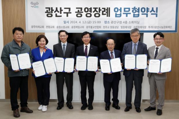 광산구는 12일 구청 4층 소회의실에서 광주미래교회, 본향교회, 송정소망교회, 송정제일교회, 광주불교연합회, 천주교원동성당, 수완장례식장, 빛장례식장, 투게더광산 나눔문화재단 등 9개 기관과 ‘광산구 공영장례 업무협약’을 체결했다.