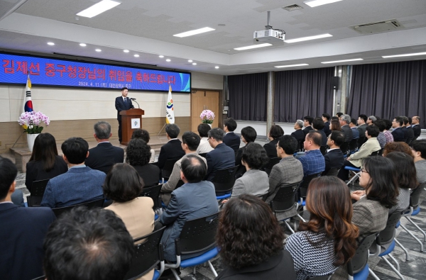 김제선 청장은 보훈공원 참배 후 첫 출근하여 사무인계인수를 마치고, 중구청 대회의실에서 간부직원들이 참석한 가운데 취임식을 진행한 후 각 부서를 돌며 직원들과 취임 첫 인사를 나누었다.