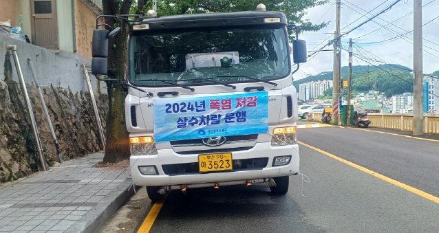▲ 부산 중구(구청장 최진봉)는 폭염이 지속되는 가운데 무더위를 식히고 쾌적한 도로환경을 제공하기 위해 7월 22일(월)부터 대청로, 중구로, 망양로 등 관내 주요도로에 살수작업을 실시하고 있다고 밝혔다. |