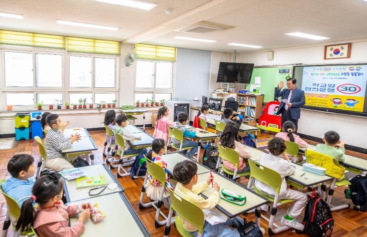 구청장 교통안전교실 일일강사는 봉학초등학교 2학년 2반 어린이를 대상으로 어린이날 축하인사를 시작으로 학교통학 시 보행 유의사항, 횡단보도 건널 때 파란불이 들어와도 잠시 기다리기, 스마트폰을 보면서 걷는 사람들(스몸비)에 대한 퀴즈 등 어린이 눈높이에 맞춘 교육과 함께 어린이날 선물 전달 등 순으로 진행되었다.