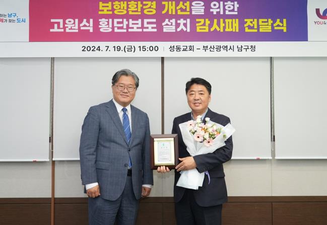 [뉴스서치] 부산 남구는 19일에 고원식 횡단보도 설치로 안전한 보행환경을 조성한 것에 대해 성동교회로부터 감사패를 받았다.