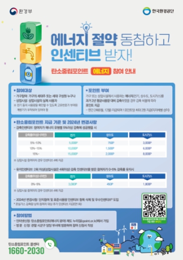 탄소중립포인트제는 가정에서 과거 2년간의 월평균 사용량 대비 5%이상 에너지 사용량을 감축한 가구에 현금(계좌입금), 울산페이, 그린카드 포인트, 기부 중 참여자가 선택한 방법으로 연 2회 인센티브를 지급한다.