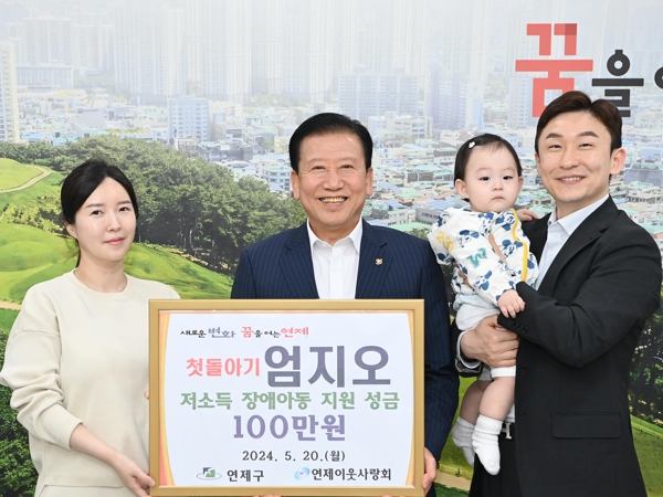 주석수 연제구청장은 “일 년 사이 훌쩍 자란 지오를 다시 만나니 반갑고, 아이 돌을 기념하여 의미 있는 후원을 해 주신 부모님이 존경스럽다”며 “성금은 장애가 있는 저소득 아동들을 위해 잘 사용하겠다”라고 감사의 마음을 전했다.