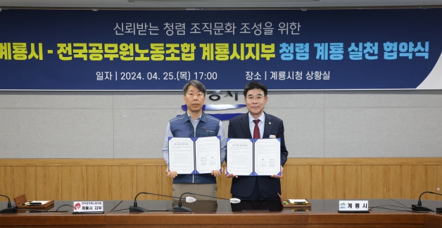 [뉴스서치] 계룡시는 전국공무원노동조합 계룡시지부는 25일 시청 상황실에서 청렴계룡실천을 위한 상호협력협약을 체결했다고 밝혔다.