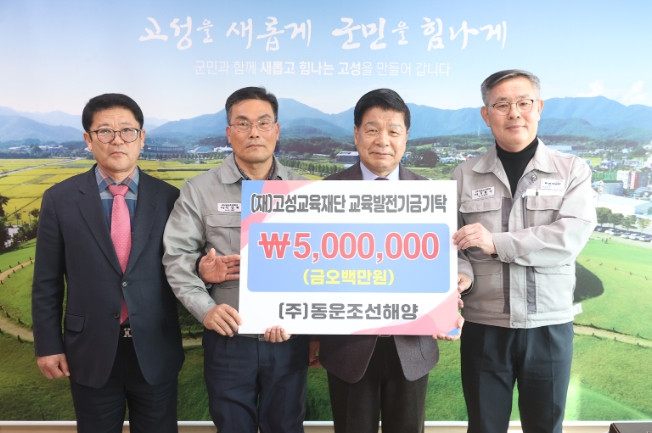 고성군은 지난 14일 ㈜삼도인더스트리(대표 이도경)가 동해초 지정 기탁으로 6백만 원, ㈜동운조선해양(대표 신승수)이 5백만 원을 교육 발전 기금으로 고성교육재단에 기탁했다고 밝혔다.