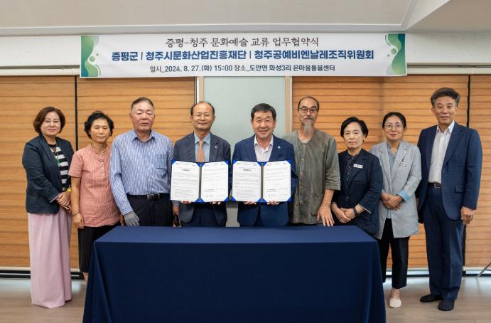 군은 27일 도안면 화성3리 온마을돌봄센터에서 이재영 군수, 변광섭 청주문화재단 대표이사 겸 비엔날레집행위원장이 참석한 가운데 문화예술 교류 업무협약을 체결했다.