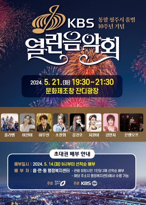 ‘통합 청주시 출범 10주년 기념 KBS 열린음악회’에는 가수 김연자, 소찬휘, 김경호, 이무진, 홀리뱅, 이진아, 지원이, 온앤오프가 출연해 전 세대가 즐길 수 있는 다양한 공연을 선사한다.