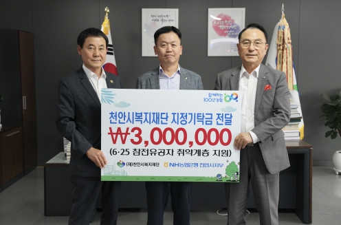 박상돈 시장은 “참전유공자의 공훈에 대한 보훈으로 기탁해주신 NH농협은행 천안시지부에 감사드리며, 오늘날의 조국을 있게 해 준 역사를 기억하고 국가보훈대상자에 대한 감사함을 되새길 수 있는 시간을 마련하기 위해 천안시도 최선을 다하겠다”고 밝혔다.