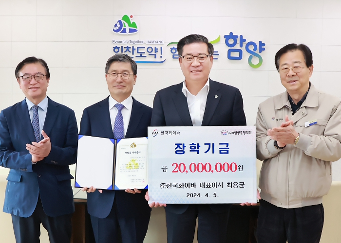 이날 오전 ㈜한국화이바에서는 대표이사 최용균을 비롯한 임원 2명이 군청을 방문하여 2,000만원의 장학금을 기탁했다. 4월 1일 취임한 최용균 신임 대표이사는 지역사회의 발전과 청소년 교육 지원에 대한 깊은 관심을 가지고, 이번 기탁을 통해 “젊은 세대에 대한 투자는 가장 가치 있는 투자라는 믿음을 실천에 옮겼다”고 밝혔으며 “기업의 사회적 책임과 지역 발전을 위한 역할을 하겠다”라고 전했다.
