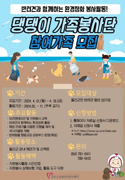 해당 봉사활동은 ‘댕댕이 가족봉사단’이라는 이름으로 오는 19일까지 반려견과 함께하는 울진군민 20가구를 모집하여 관내 해안가 및 산책로에서 활동할 예정이다.