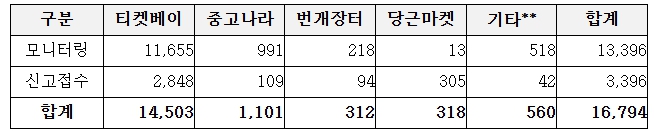 2026년 2월부터 3월까지 프로야구 암표 신고·모니터링 결과, 약 1만 6천여 건이 확인됐다. 특히 개막전(3. 28.~29.) 전후로는 정가 대비 최대 약 13배 고액 거래, 동일 계정 다량 좌석 확보 및 재판매 등 조직적 거래 정황이 다수 확인됐다. 이 중 다량·연석 판매, 과도한 웃돈 거래, 동일 계정 반복 거래 등 부정거래 의심 사례를 분석․파악해 경찰청에 수사를 의뢰했다.
