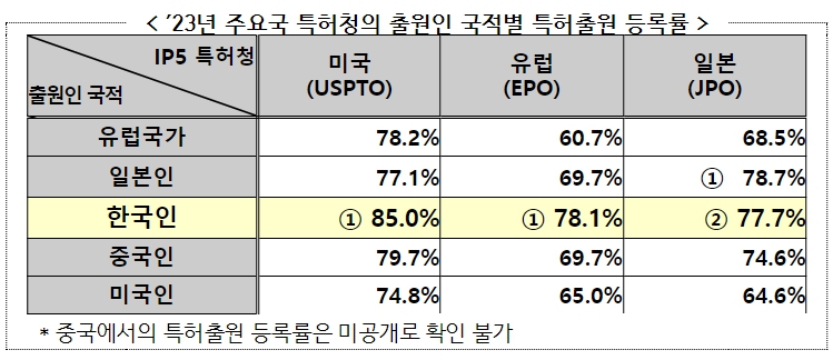 ’23년 미국, 유럽에서 심사된 한국인의 출원 중 특허로 인정받은 건의 비율은 각각 85%, 78.1%로 IP5 국가별 특허출원 중 가장 높았으며, 2위인 중국과도 5%p 이상 차이를 보였다.