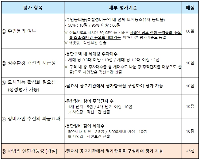 (선정방식) 주거단지 정비형, 중심지구 정비형 등 사업 유형과 연립주택, 아파트, 주상복합 등 주택 유형에 관계 없이 단일 기준에 따라 고득점 순으로 선정한다. 다만, 특정 유형에 쏠림이 발생되지 않도록 지자체가 유형별로 안배할 수 있게 했다.