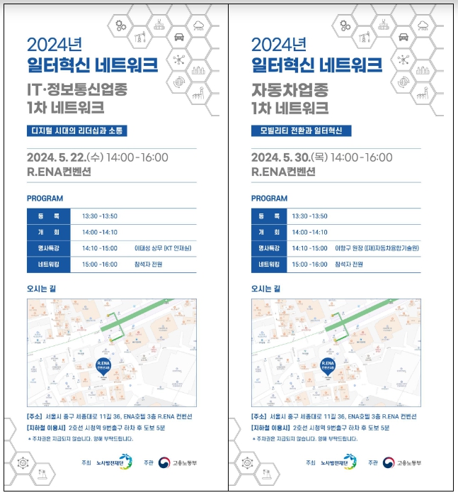 5월 22일과 5월 30일, R.ENA컨벤션(서울 중구)에서 진행되는 「제1차 업종별 일터혁신 네트워크」는 정보기술(IT)·정보통신업종 35개 기업과 자동차업종 22개 기업이 참여한다. 이들은 네트워크를 통해 업계 이슈, 일터혁신 컨설팅 참여 경험 등을 공유하고, 일하기 좋은 회사를 만드는 방안을 함께 나눌 예정이다.