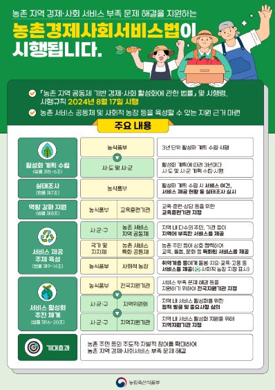 [뉴스서치] 농림축산식품부는 '농촌 지역 공동체 기반 경제ㆍ사회 서비스 활성화에 관한 법률 시행령, 시행규칙'이 제정되어 8월 17일 시행된다고 밝혔다.