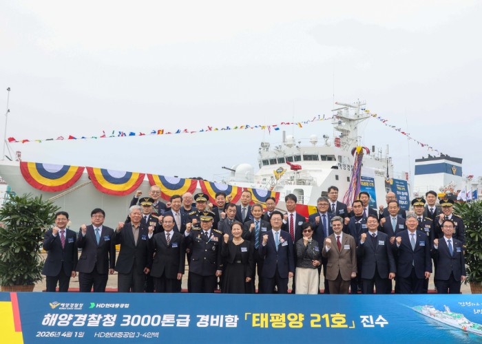 [뉴스서치] 해양경찰청은 4월 1일, 울산광역시 동구에 소재한 HD현대중공업㈜에서 3000톤급 신형 경비함 태평양 21호(3021함)의 진수식을 개최했다.