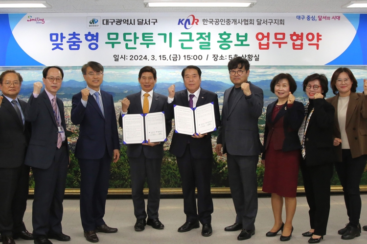 [뉴스서치] 대구 달서구가 15일 구청 5층 상황실에서 한국공인중개사협회 대구달서구지회와 쓰레기 무단투기 근절을 위한 홍보 업무협약을 체결했다.