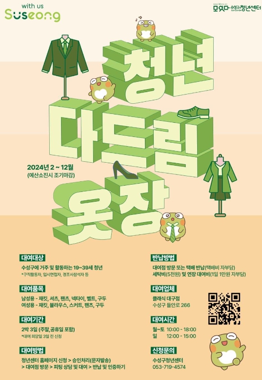자세한 사항은 수성구청년센터 홈페이지 ‘청년 다드림 옷장’ 메뉴에서 확인할 수 있다.