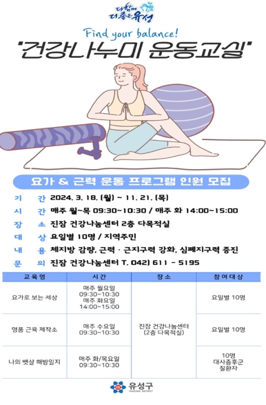 [뉴스서치] 대전 유성구는 오는 3월 18일부터 11월까지 주민 맞춤형 운동프로그램을 제공해 건강격차를 해소하는 건강나누미 운동교실을 운영한다.