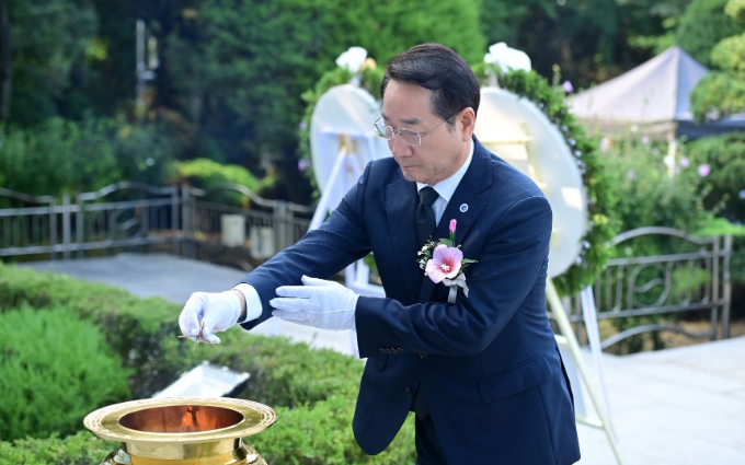 ▲ 유정복 인천광역시장이 15일 제79주년 광복절을 맞아 수봉공원 현충탑에서 헌화와 분향을 하고 있다. |