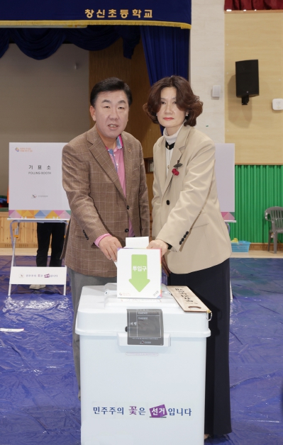 [뉴스서치] 이범석 청주시장은 제22대 국회의원선거 사전투표 첫날인 5일 오전 9시, 서원구 사창동 창신초등학교 강당에 마련된 사전투표소에서 배우자(정은경)와 함께 사전투표에 참여했다.