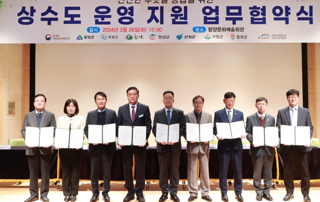 26일 오후 함양문화예술회관에서 낙동강유역환경청, 함양군 등 경남지역 7개 군 과 한국수자원공사가 참여한 가운데 상수도시설 운영 전문성 향상 및 수도사고 대응 체계 고도화를 위한 ‘상수도운영지원협의회’를 발족하고 ‘상수도시설 운영 협력 강화 협약’을 체결했다.