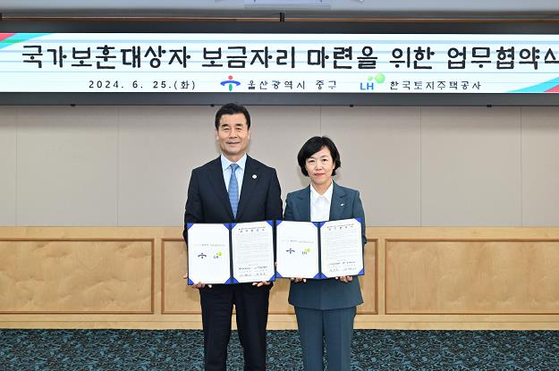 [뉴스서치] 울산 중구와 한국토지주택공사(LH) 부산울산지역본부가 6월 25일 오후 2시 15분 중구청 2층 중회의실에서 전국 최초로 ‘무주택 국가보훈대상자의 보금자리 마련을 위한 업무협약’을 맺었다.