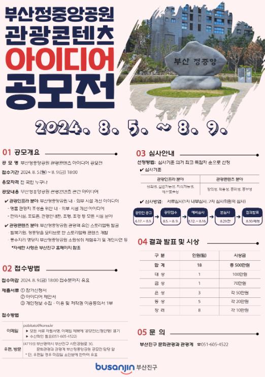 김영욱 부산진구청장은 “이번 부산정중앙공원 관광콘텐츠 아이디어 공모전은 부산정중앙공원을 널리 알리는 기회가 될 것”이라며 “많은 분들이 부산정중앙공원 관광 활성화에 기여할 수 있는 좋은 아이디어 제안해 주시기를 바란다”고 전했다.