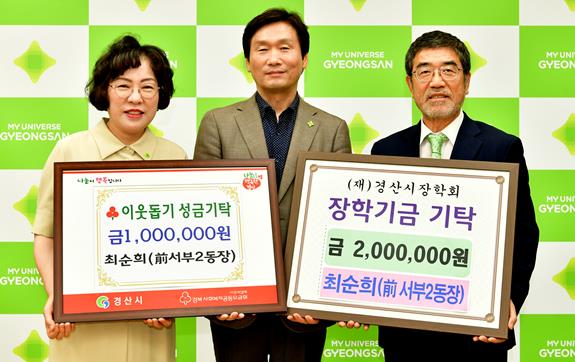 최순희 전(前) 서부2동장은 “경산에서 태어나고 자라 평생을 산 이곳에서 공직 생활을 마무리하면서 그동안 받은 사랑에 조금이나마 보답하고자 기부하게 됐다”며 “경제적으로나 환경으로나 발전해 나가는 경산이 내 고향이라는 것에 항상 자부심과 감사함을 느끼고 있다. 적은 돈이지만 우리 지역을 끌어 나갈 후배님들이 꿈과 희망을 마음껏 펼치는 데 도움이 되었으면 좋겠다. 공직은 떠나지만, 늘 주위를 돌아보며 어려운 이웃들에게 관심을 두고 나눔을 실천하도록 최선을 다하겠다”고 했다.