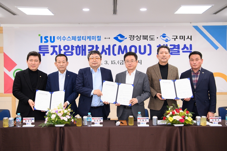 [뉴스서치] 구미시는 15일 시청에서 이철우 경북도지사와 김장호 구미시장, 김상범 이수그룹 회장, 류승호 이수스페셜티케미컬 대표 등이 참석한 가운데 구미국가산업단지 내 공장 신설을 위한 투자양해각서(MOU)를 체결했다.