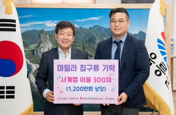 [뉴스서치] 울릉군이“㈜더 메종과 ㈜엠캐스팅에서 지난10일 울릉군청을 방문해 경북 사회복지공동모금회를 통해 관내 취약계층 지원을 위한 마틸라 사계절 이불 300점(1,200만원 상당)을 기탁했다.”고 밝혔다.