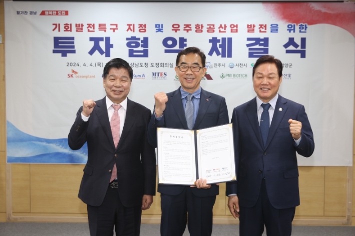 [뉴스서치] 고성군은 4일 경남도청에서 개최된 ‘기회발전특구 지정 및 우주항공산업 발전을 위한 투자 협약식’에서 경남도 및 SK오션플랜트와 투자협약을 체결했다고 밝혔다.